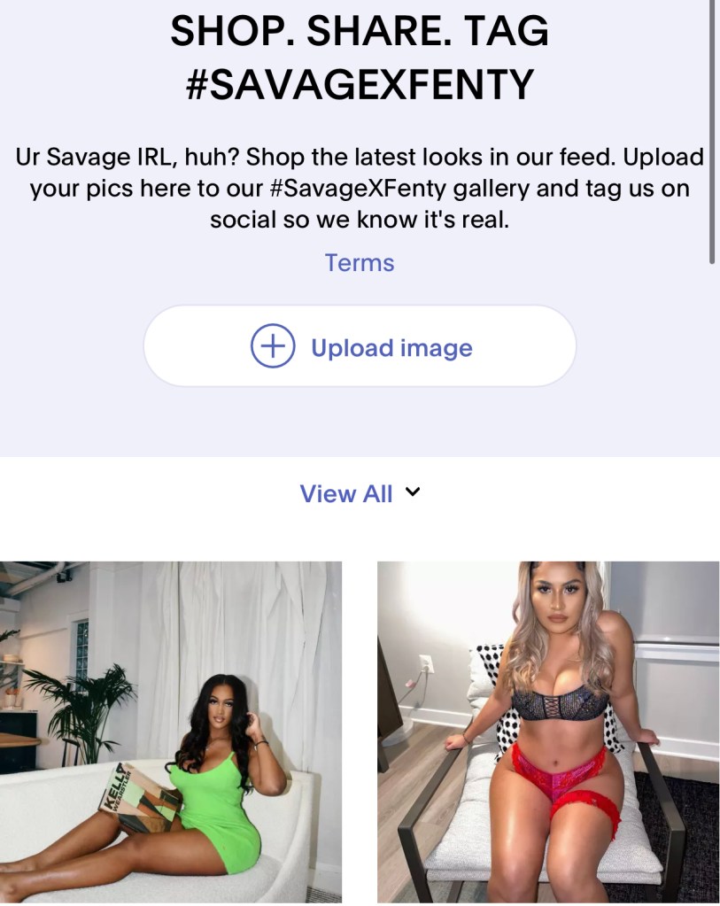 Savage X Fenty relies heavily on UGC to continue customer retention, gain new customers, and gain brand awareness. On their website, Twitter, and Instagram pages, Savage X Fenty features women who post pictures in their lingerie using the hashtag they created. Anyone can upload pictures all you have to do is wear the product and tag the company using the #savagexfenty hashtag to be featured. This is all voluntarily done by people whether they are fans of Rihanna or just simply like the clothes. This hashtag is very effective because there are so many people who post in it and love the clothes they produce.