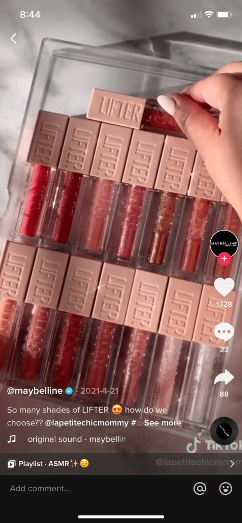 Brands that have already published content on TikTok should reuse their videos for Reels since they are similar platforms. Keep in mind that your videos can only be 60 seconds on Instagram so if your TikTok is too long it won’t cross over! Audio licensing is also different on each platform, therefore you should not download the TikTok video and repost the same file with audio only licensed for use on TIkTok. Be sure you are posting your own original content. Maybelline is one example of a brand that does a good job with this, they often post the same products on both of their platforms with similar videos, or they repost the same video.