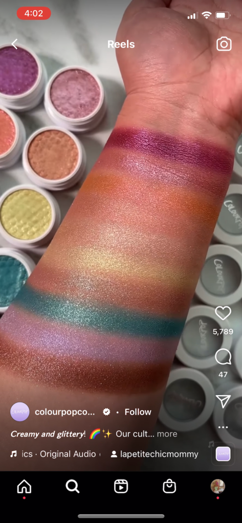 Check out how ColourPop cosmetics company showcased their eyeshadow. In their Instagram Reel they display multiple shades of the eyeshadows on the arm to highlight its incredible creamy glittery qualities.