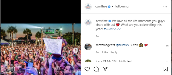 Take Carolina Country Music Festival (CCMF) which is held in Myrtle Beach, SC for example. They start their marketing for the festival immediately after the event held the year prior. They create engaging posts to allow users to comment about their favorite memories and moments while at the music festival. They create multiple posts per week to allow them to listen and engage with the fans about the event and get them more excited.