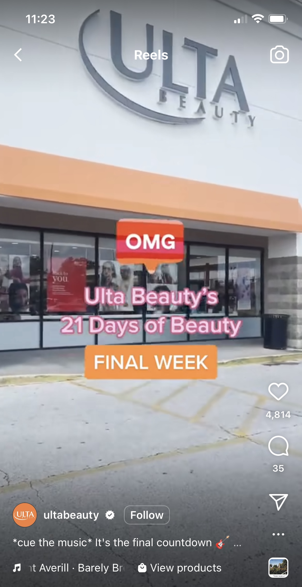 6) Sales Talk: What is better than seeing that an item you’ve had your eye on is now on sale? Nothing, nothing is better than that. Using Instagram Reels to show your audience that you are having a sale will draw attention. Everyone loves a good sale and if it is promoted well enough you can get new interaction on your Instagram page along with on your website. Ulta Beauty every year has a sale called the 21 Days of Beauty where different products throughout those 21 days are on sale, they made an Instagram Reel showing some very popular products and their sale on them to catch the attention of their audience. Your audience will also be more likely to interact with your brand because with a sale peeking interest people will be more inclined to look at what you offer and even if they choose not to purchase anything you will still get exposure that could lead to sharing or future interaction.