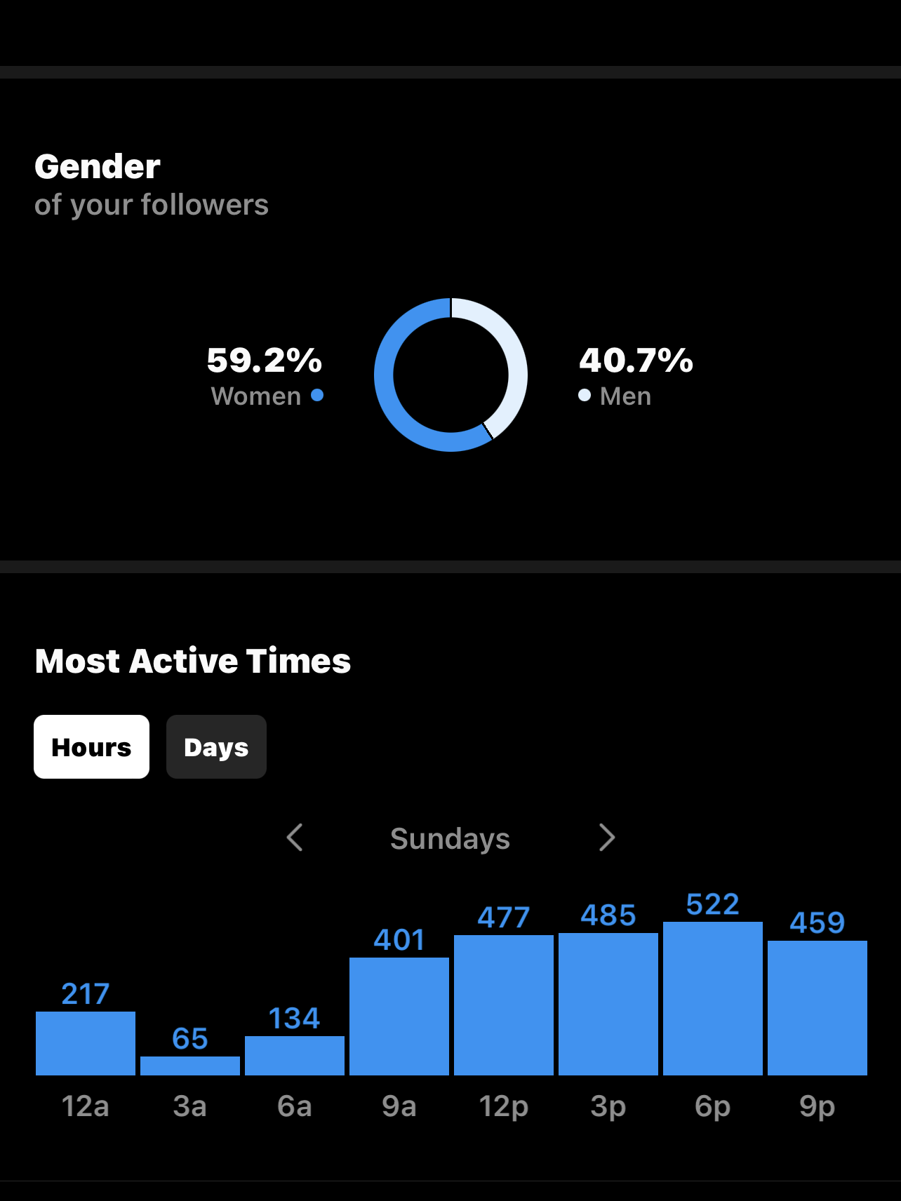 In these insights it breaks down at what day/time users will be most active on Instagram, taking into consideration your followers specifically. As shown in the photo, the user can see the predicted number of people active at specific times of the day on Sundays. Instagram also gives you breakdown of which days are most popular and what hours will have the most active users. Influencers use these metrics to determine when is the best time to post to get the most engagements and grow their brand. Strategically planning when to post your content is one of the most important aspects to growing your brand, you need to get your content in front of as many people as possible.