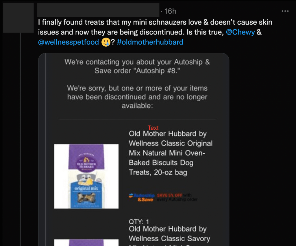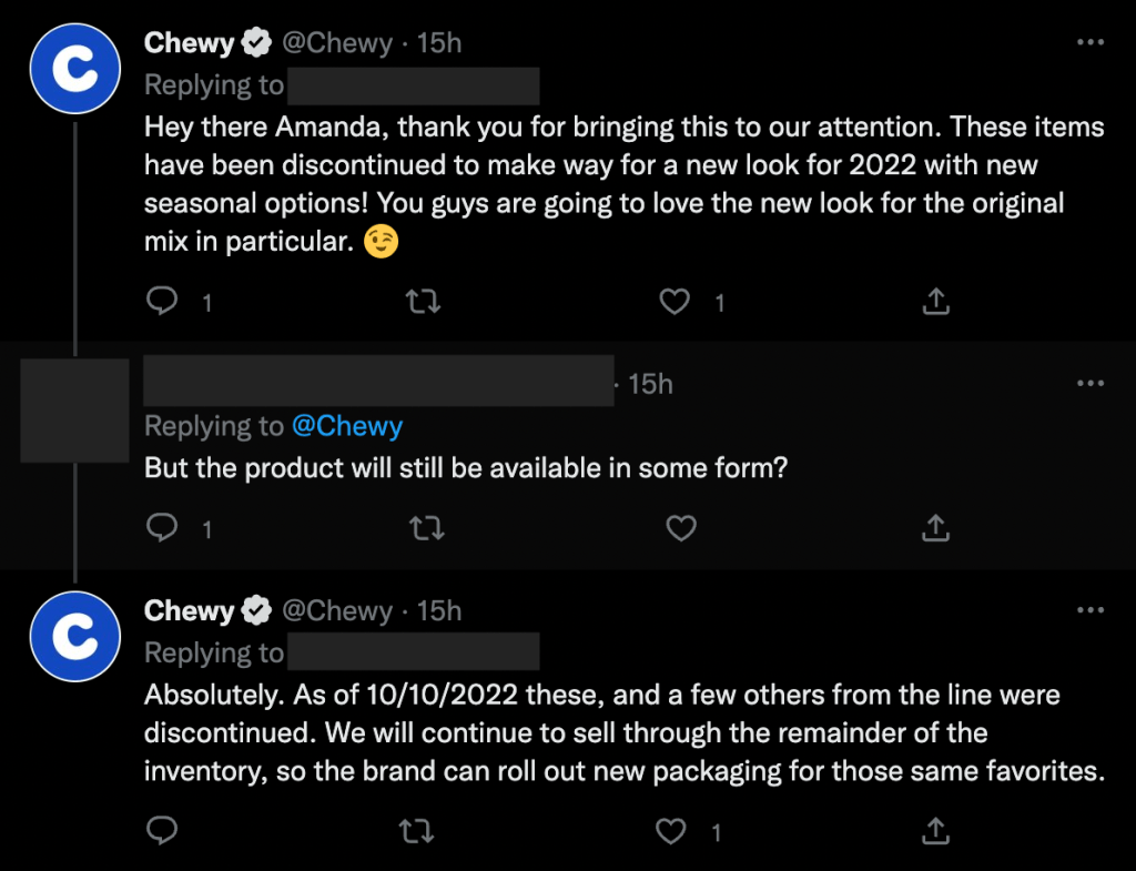 Chewy’s quick response to this concerned customer about a product they needed but, seemed to have been discontinued, not only gave the customer a quick answer, but as well as reassurance of how Chewy is there for their customers.