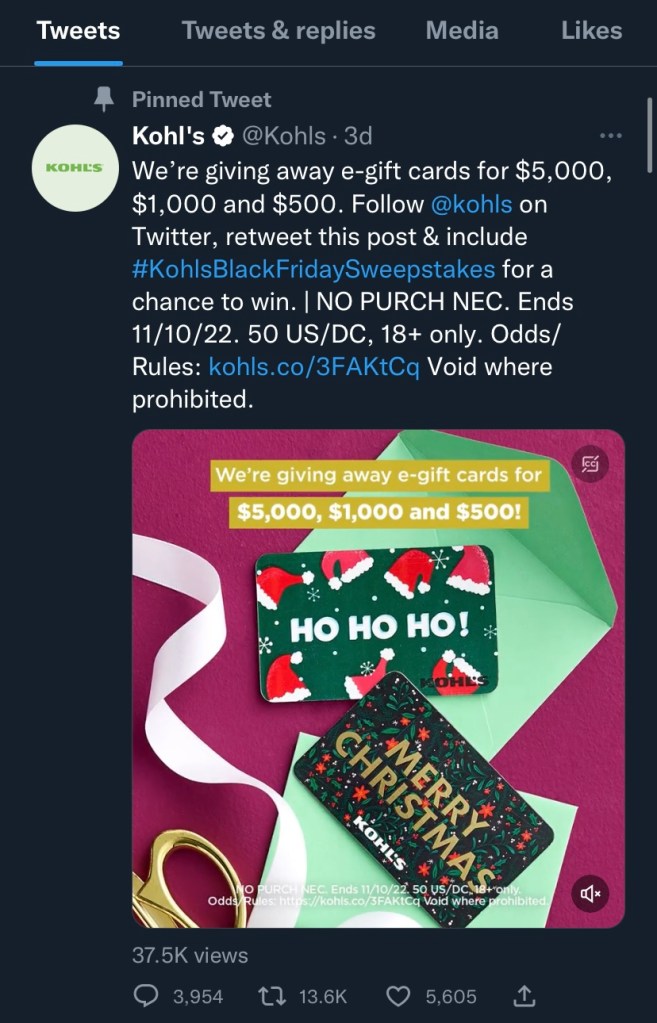 Kohl’s published their rules on their Twitter and they also added a document. A requirement of the Federal Trade Commission (FTC) is that businesses promoting a sweepstake or contest must include a hashtag of either #sweepstake or #contest. The FTC noticed that when a business does not clearly state that the post is a contest or sweepstake or related to one, any followers or people hoping to participate would not know it was a contest and think its just a brand promotion. Kohl’s made sure to do that and added #Kohl’sBlackFridaySweepstakes in their Twitter Post.